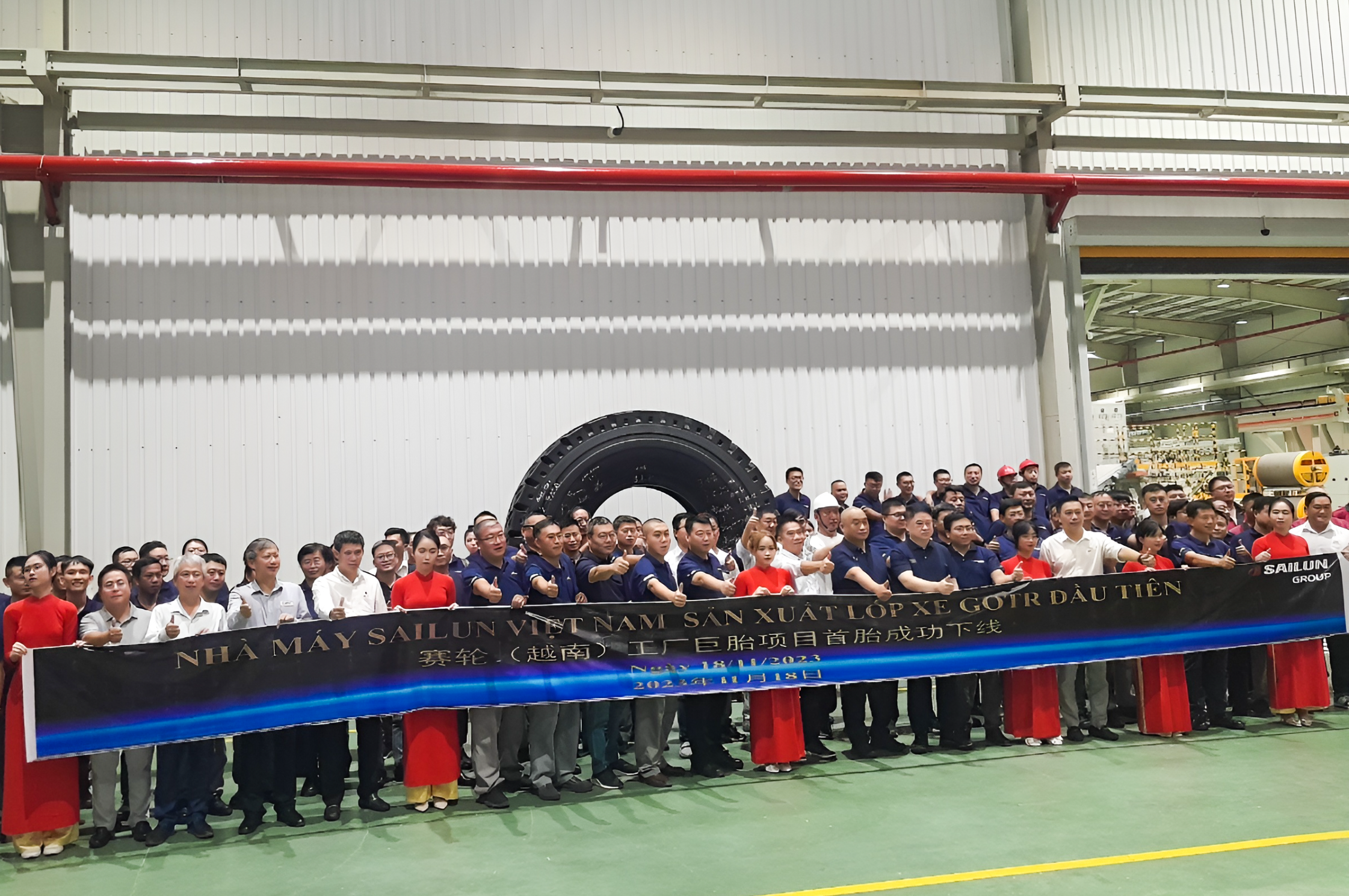 On November 18th, 2023, Sailun Vietnam Co., Ltd organized the first tyre completion ceremony GOTR – The largest tyre production line in Vietnam. The ceremony was taken place successfully by members of the Company and guests representing other units. Even more wonderful, today is also the birthday anniversary of Sailun Group, the combination of the above two events created a solemn and majestic atmosphere.