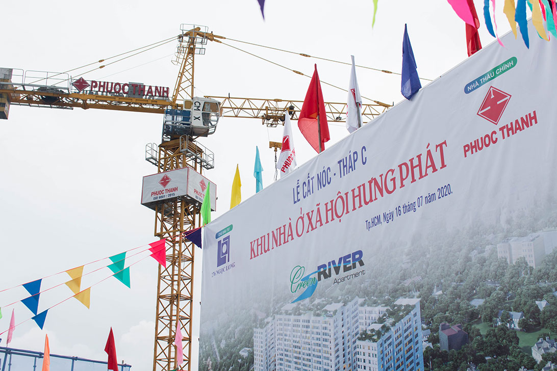 The Hung Phat Social Housing – Green River Apartment Project isone of the social housing developments for which Phuoc Thanh Construction serves as the general contractor. Thanks to the continuous efforts of the on-site engineering and management team, Tower C of the project has now been topped out.