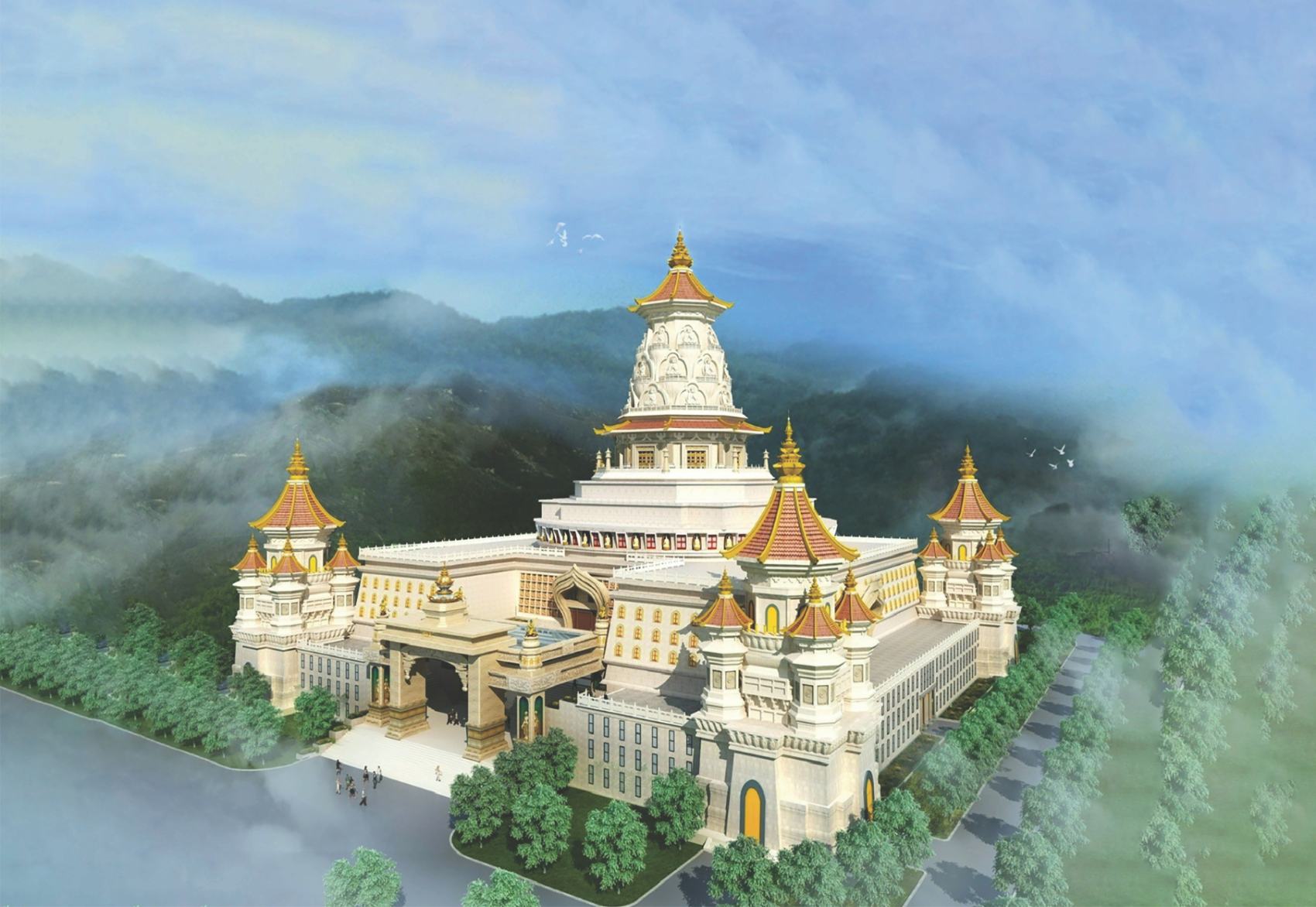 The International Buddhist Conference Center project is located in Tan Kien Commune, Binh Chanh District, Ho Chi Minh City, and is invested by the Executive Council of the Vietnam Buddhist Sangha. The development includes a conference block (2 basement levels, 6 above-ground floors, and a roof structure) and a service block (1 basement level and 3 above-ground floors). The project is designed with modern architecture, meeting international standards.