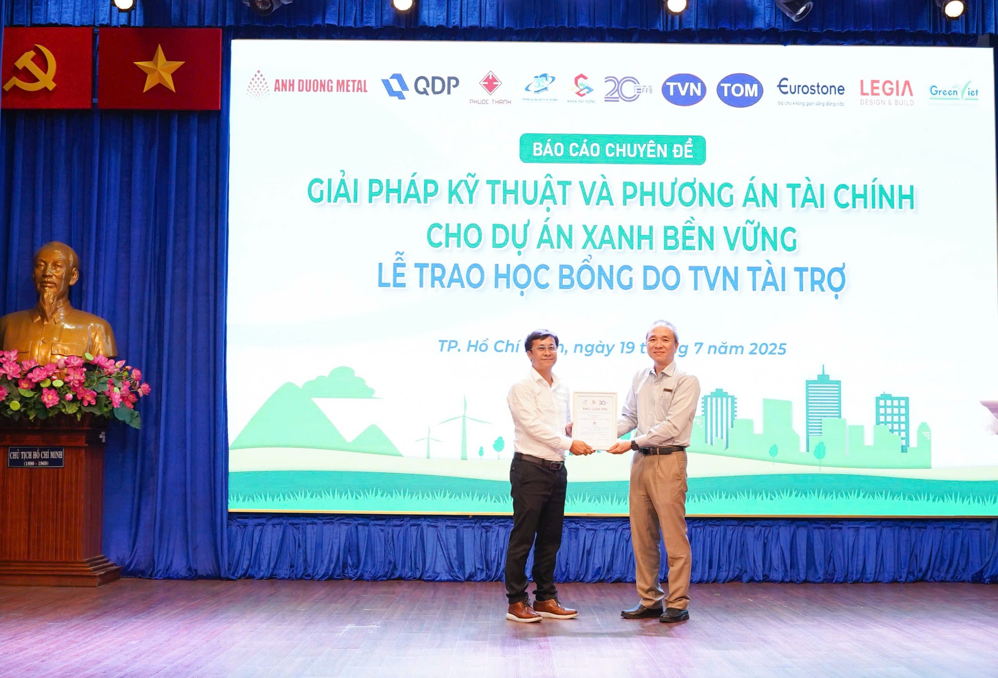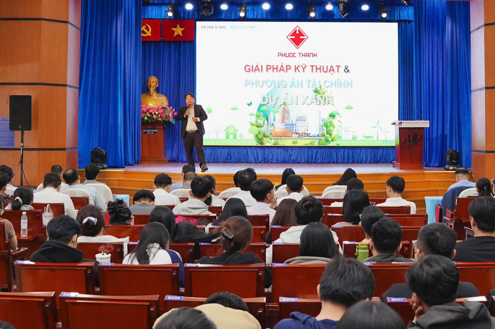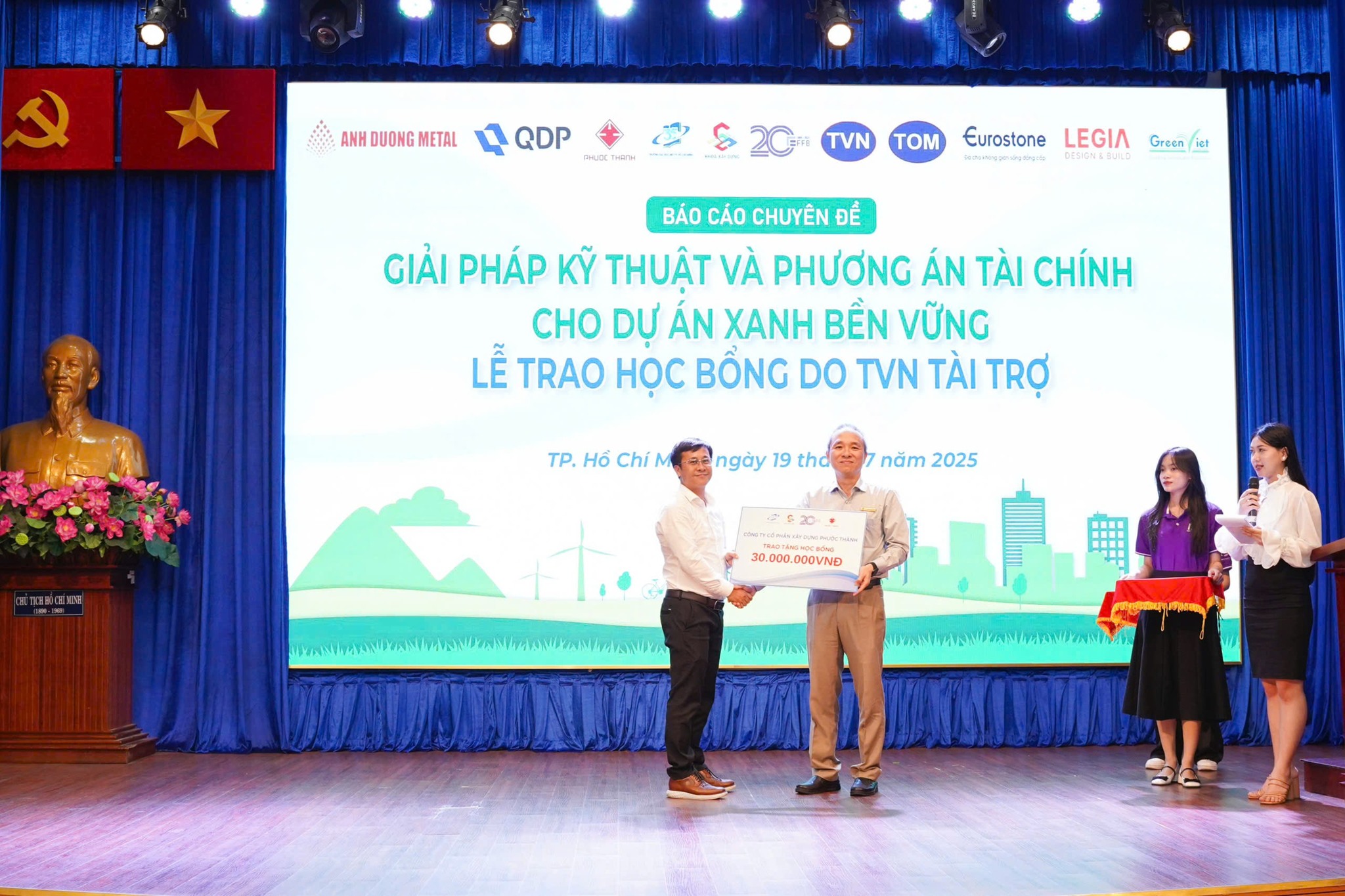 近日,福成建设股份公司董事会参加了在胡志明市开放大学举行的专题报告会,主题为《绿色与可持续项目的技术解决方案与财务方案》,并结合了由 TVN 赞助的奖学金颁发仪式。该活动由建筑学院与金融–银行学院联合举办,旨在为学生提供动力并补充实践知识。